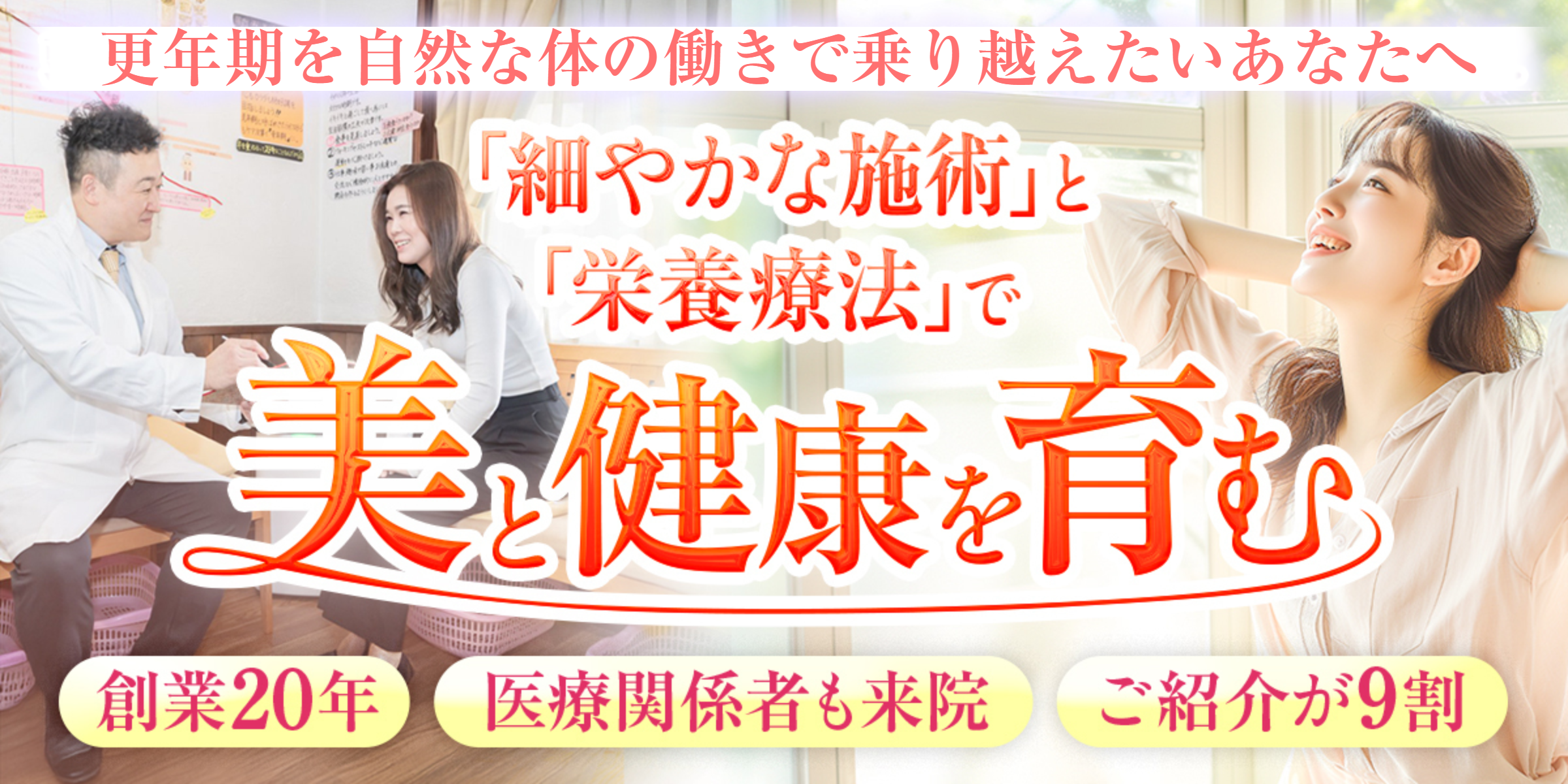 当院は9割が女性です。素敵な方ばかりで、お仕事・家事・子育てに一生懸命、ガンバられている皆さまを間近で見て「縁の下の力持ちで働き者の皆さまのお悩みを解決して、喜んでもらいたい」その思いで、多くのご紹介をいただける様になり開院して20年が経ちました。